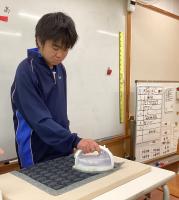 中学部2年生 職業・家庭科「洗濯をしよう」では、エプロンとバンダナのアイロンがけを行いました。アイロンの安全な使い方を確認した後、シワができないようにしっかり広げて置き、布を伸ばしながらアイロンをかけることができました。