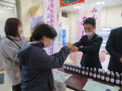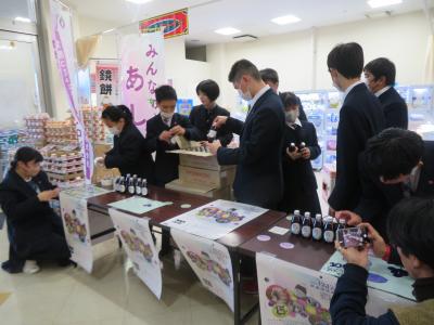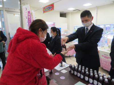 令和7年12月12日(金)に、常陸コミュニティデザイン株式会社と行っている「OTAぶどうプロジェクト」の取り組みの一環として、かわねやフェスタ店でぶどうジュースの販売会を行いました。中・高等部の生徒会役員8名が店頭に立ち、お客様に笑顔で呼びかけ、チラシ配りをしたり、購入本数を聞いてぶどうジュースをカゴに入れたりしました。また、店内放送で、ぶどうジュースのPRもしました。販売会を通して、たくさんのお客様に、おいしいぶどうジュースと笑顔を届けることができました。