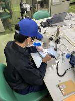 高等部1年生の家庭科で、洗濯について学習をしました。ラー油を垂らした布を水のみと洗剤入りの水につけて汚れの落ち具合を調べました。生徒からは「水だけでは汚れが落ちていない。」という声が上がり、洗剤の効果を知ることができました。