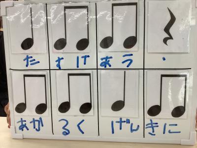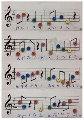 11月~12月の授業では“音楽づくり”で作曲にチャレンジしました。音符・休符カードを枠に並べて言葉を当てはめながらリズムを作ったあとに、キーボードで音を確かめながら音符マグネットを貼ってメロディーを作りました。「学級目標の言葉を使って」というテーマ以外は自由に、友達と相談し合いながら作詞・作曲に取り組み、4クラス分をつなげて楽しい曲ができました。